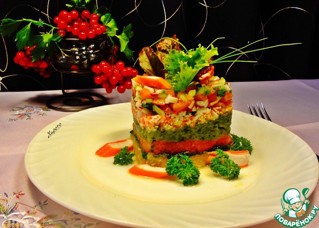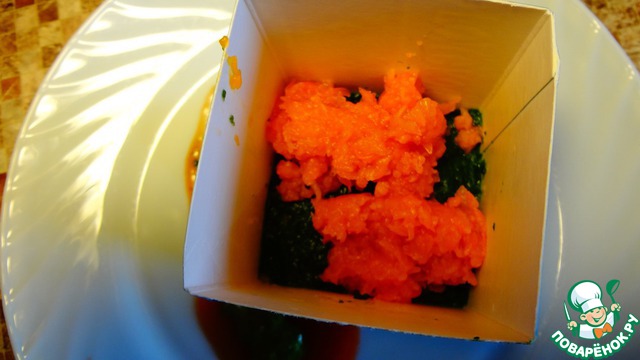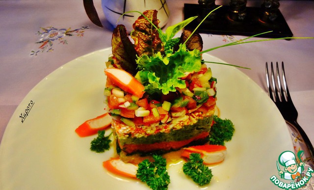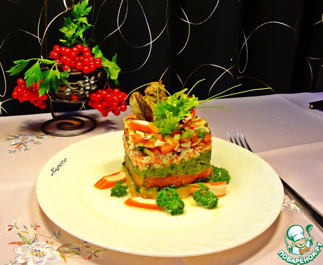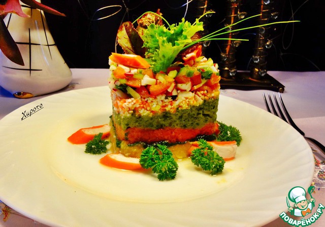 Взять квадратную форму и начать укладывать слои, немного утрамбовывая каждый. Первый слой был из брюквы, потом бланшированный шпинат, потом морковь. Слой авокадо, крабовые палочки и сверху тартар из овощей.