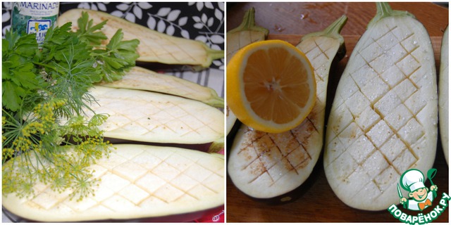 Баклажаны помыть и разрезать вдоль. Мякоть надрезать крест-накрест. Посолить и сбрызнуть лимонным соком.