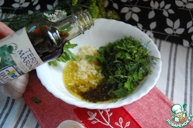 Приготовим маринад. В миску налить масло, добавить измельченную зелень, измельченный чеснок, черный перец крупного помола, маринад терияки.