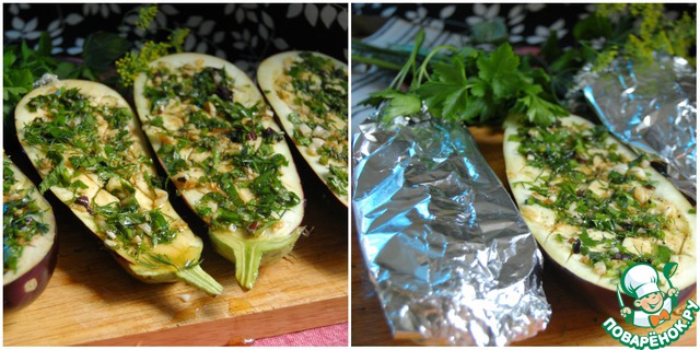 Маринадом тщательно смазать баклажаны, затем аккуратно завернуть их в фольгу и поставить в холодное место на 1,5- 2 часа, чтобы баклажаны замариновались.