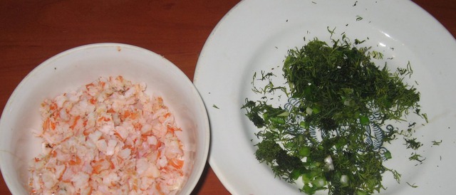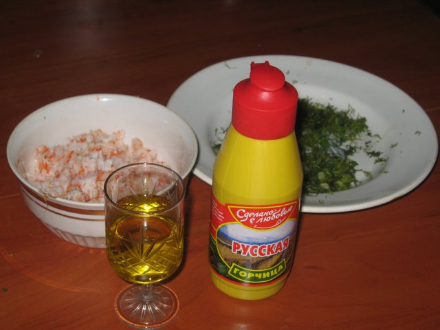 Cмешайте 1 ст. л. оливкового масла (можно заменить подсолнечным), 1-2 ст. л. горчицы (ее можно заменить горчичным соусом, вкус будет мягче. Особенно советую тем, кто горчицу не любит), порубленную зелень и креветки.