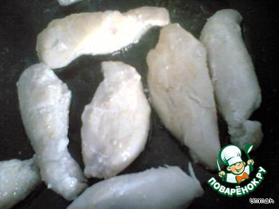 Сыр нарезать такими же размером кусками, какими получилось обжаренное филе курицы.
