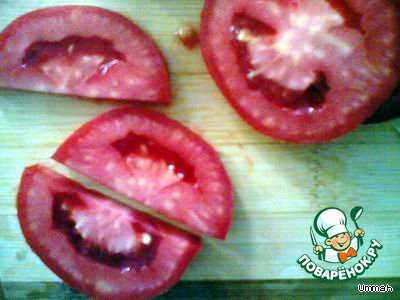 Уложить кусок куриного филе, томат и сыр на пласт обжаренного баклажана.