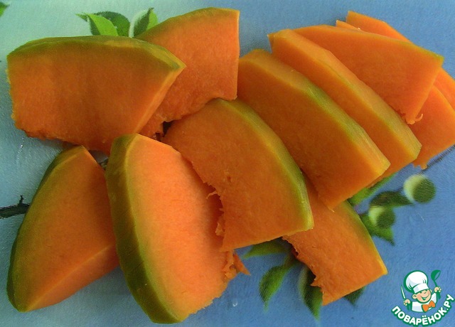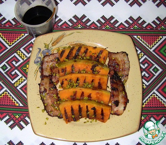 Тыква у меня замороженная, заранее вытаскиваю с морозильника, нарезаю на дольки и обжариваю на сковороде гриль или на гриле если Вы отдыхаете на природе.