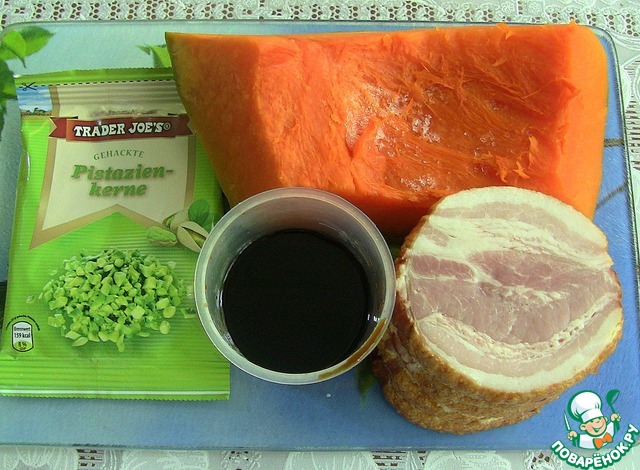 Когда тыква и бекон готовы заправляем все соевым соусом, и посыпаем измельченными фисташками, солить не надо, можно кушать как в теплом так и в холодном виде. Надеюсь такая легкая и вкусная закуска Вам придется по душе!