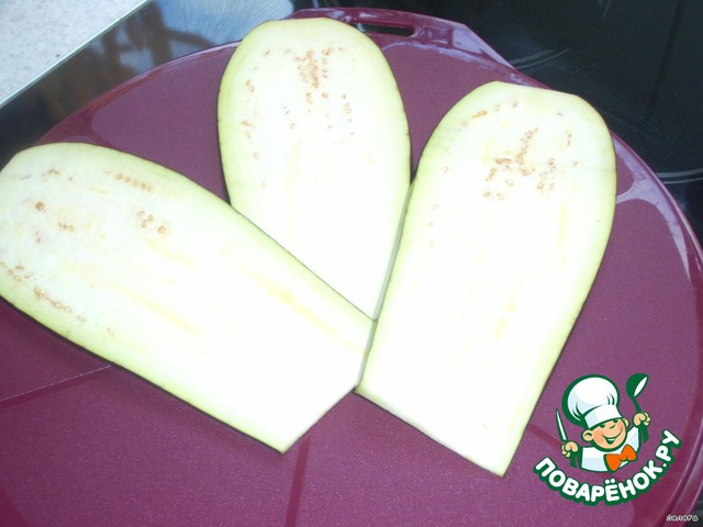 Нарезать баклажаны на пластинки - языки, посыпать солью и поставить на 15 минут, после промыть их в холодной воде.