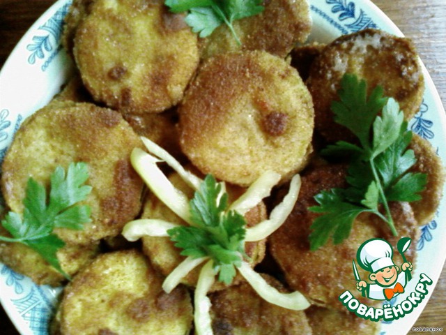Нарезать кольцами кабачок. Разболтать яйцо, добавить в яйцо приправы (вместо соли я брала "Мивину"). Макать в яйцо колечко, а потом в сухари. Жарить с двух сторон до образования золотистой корочки. Можно подавать с чесночным соусом. Приятного аппетита! :)