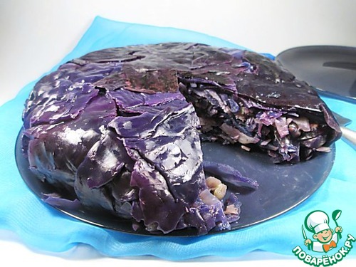 Накройте начинку сначала свисающими по бокам листьями, которые закрывают дно, а затем тоже внахлест закройте верх оставшимися 6 листьями. Накройте пирог подходящей по размеру тарелкой и поставьте на 2 часа под гнет в холодильник.