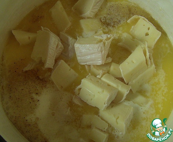 Нагреваем молоко со сливками, добавляем 0,5 ч. л. мускатного ореха, добавляем порезанный камамбер. Непрерывно помешивать пока сыр не расплавится. Соус сливочный когда немного остынет переместить в блендер, добавить 2 ст. л. соевого соуса, взбить.