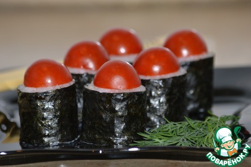 Разрезать ролл на 6 частей. Помидоры черри разрезать пополам и выложить на роллы.