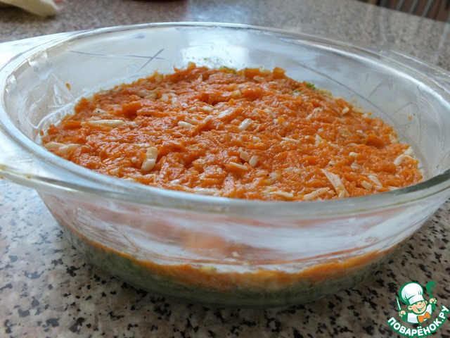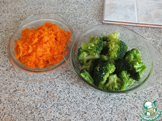 Брокколи, не размораживая, запечь в микроволновке 6 минут на средней мощности. Морковь натереть на мелкой терке.