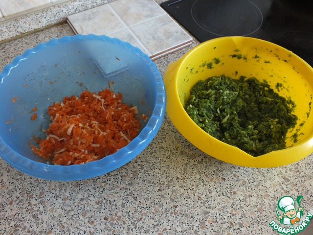 В блендер положить остывшую брокколи, зелень, 2 яйца и измельчить. Добавить 100 г. натертого сыра сулугуни, соль, перец. В морковь выдавить через пресс чеснок, добавить 2 яйца, 100 г. натертого сыра сулугуни, соль, перец.