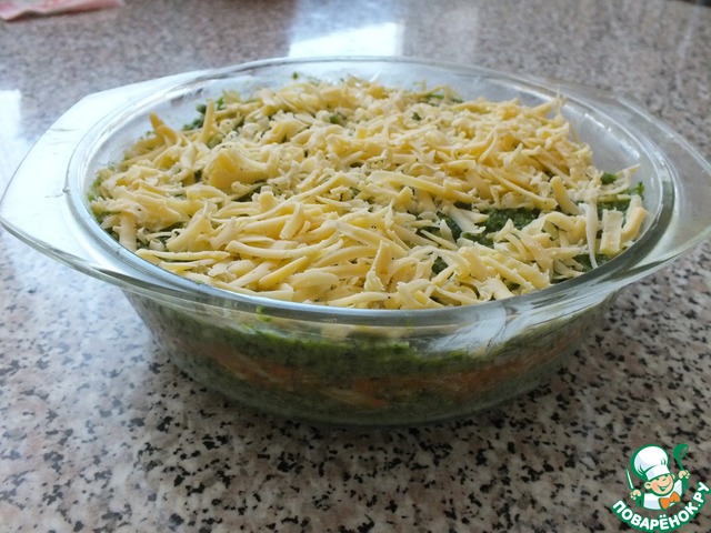 И снова слой брокколи. Сверху посыпать тертым сыром (у меня - Российский).