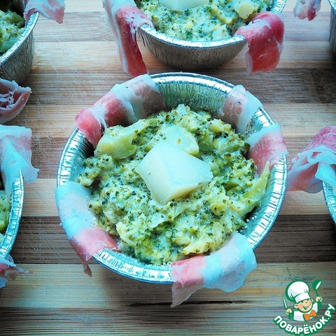 Заполнить формочки приготовленой начинкой. в центр положить кубик сыра.