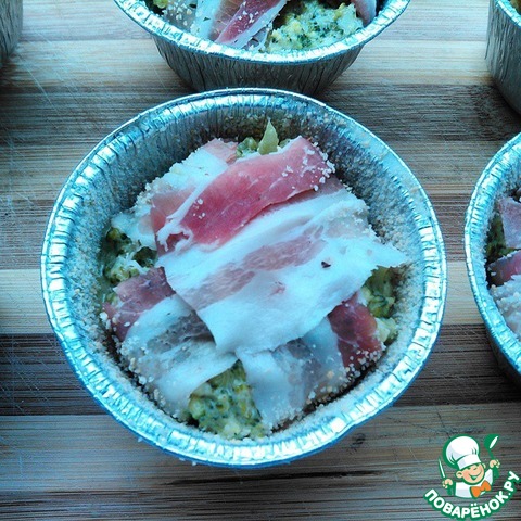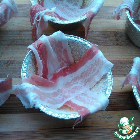 Смазать сливочным маслом и обсыпать манной крупной 6 формочек для пудинга. сверху положить "скрещенно "две полоски бекона.