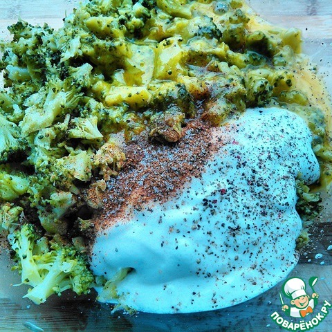 Мелко порезать брокколи. добавить сметану, яйца, по вкусу соль, перец, мускатный орех. хорошо перемешать.