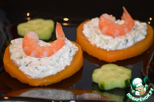 Сердечки из тыквы разложить на блюде, на каждое выложить по ложке смеси из сыра и оурца, на смесь выложить креветку.