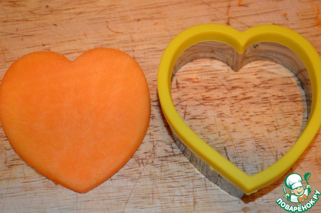 Тыкву очистить и вырезать формочкой для печения сердечки толщиной 1 см.