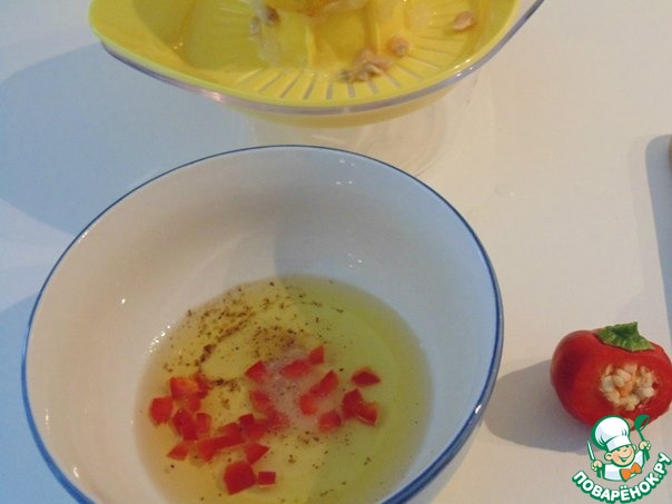 Приготовить заправку: смешать оливковое масло с лимонным соком, добавить мелкопорезанную дольку пикантного перчика, посолить, поперчить. Количество пикантности регулируйте по вкусу.