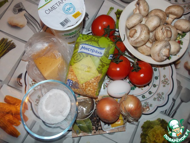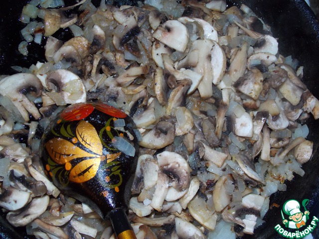 Начинаем с того что ставим варится горох... Затем обжариваем грибы с луком.