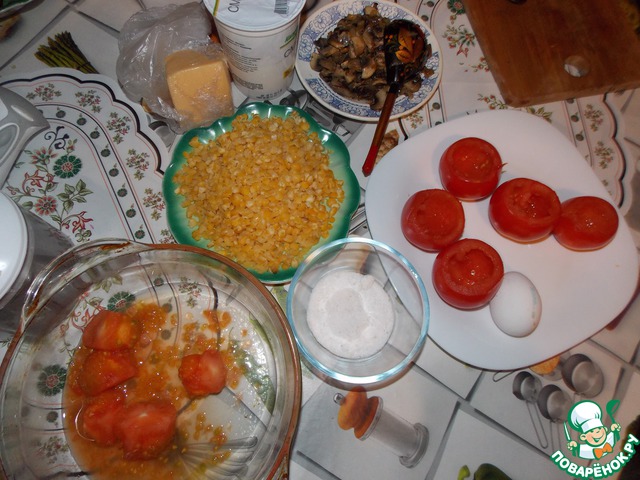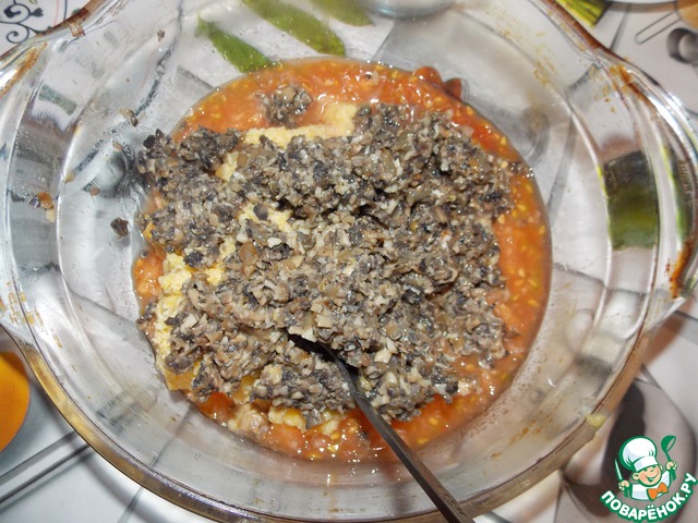 Серединки от помидор не выкидываем они нам пригодятся... Как сварился горох и пожарились грибы.. Можно приступать к приготовлению начинки. ( горох отваривала в чуть подсоленой воде, грибы когда обжаривала тоже немного посолила)