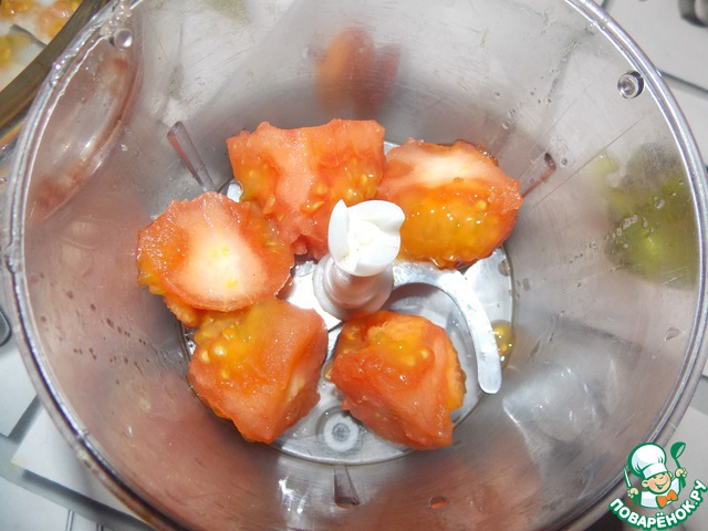 Затем измельчаем горох и добавляем его к помидорной жидкости..