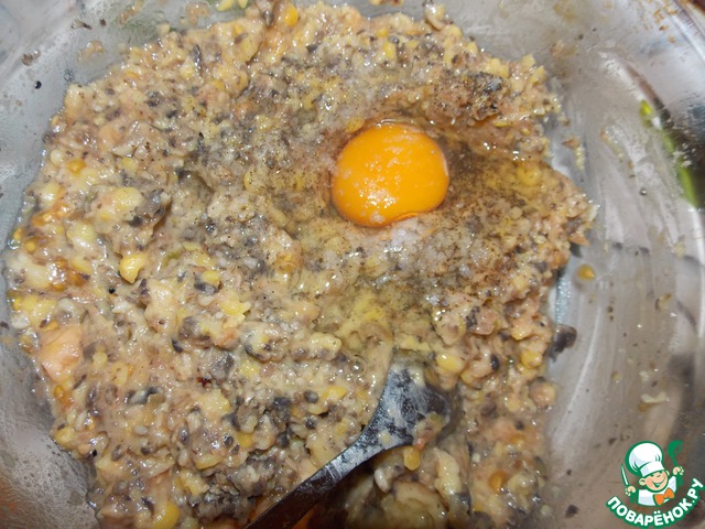Затем пробуем на соль если кажется что мало солим и перчим... Затем добавляем 1 яйцо и все перемешиваем.
