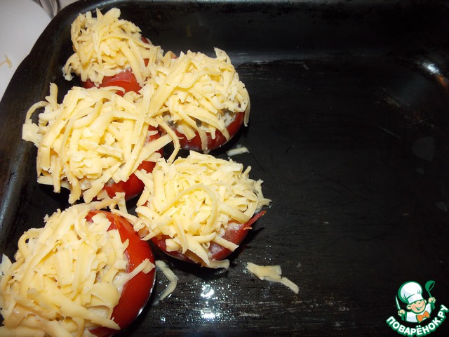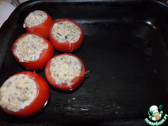 Начиняем помидоры начинкой и выкладываем на смазанный противень..