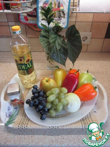 Перец болгарский нарезать крупной соломкой. Лук репчатый нарезать крупными полукольцами. Из яблок удалить сердцевину и нарезать их дольками. Виноград черный и зеленый разрезать пополам и удалить из него косточки.