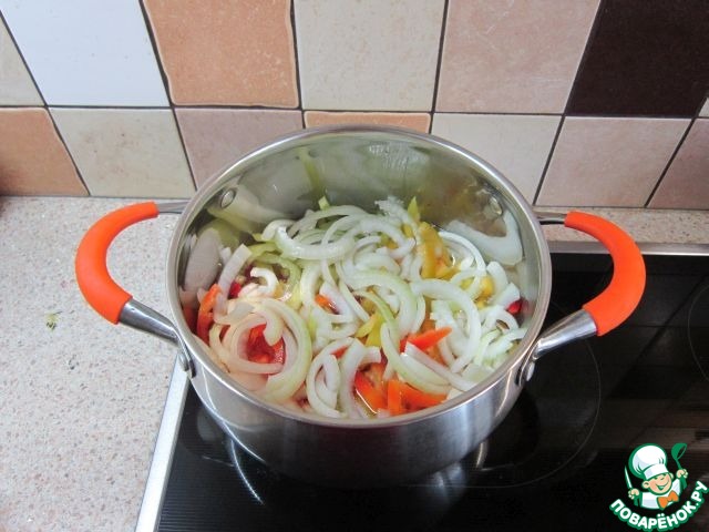 Подготовленные овощи (перец и репчатый лук) уложить в кастрюлю, залить маринадом и довести до кипения.