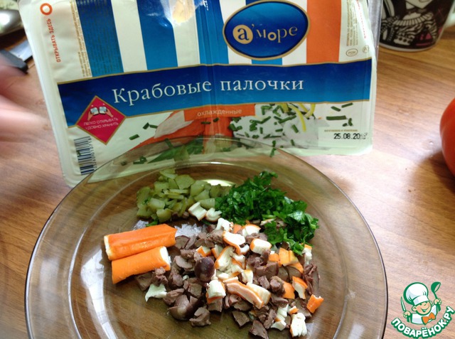 Мелко кубиками режем крабовые палочки, огурец, отварные сердечки и зелень, немного подсаливаем и перемешиваем