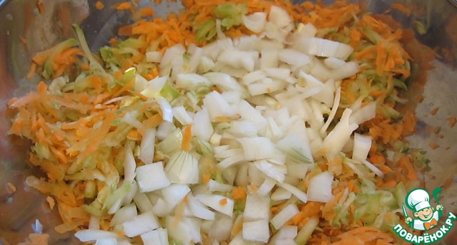 Добавляем 150 гр муки и снова перемешиваем. Также количество муки зависит от изначального размера взятых овощей)