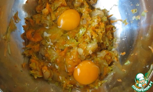 Когда овощи готовы, снова перекладываем их в миску, разбиваем 2 яйца, солим (~0,5 ч. л) и перчим по вкусу, перемешиваем.