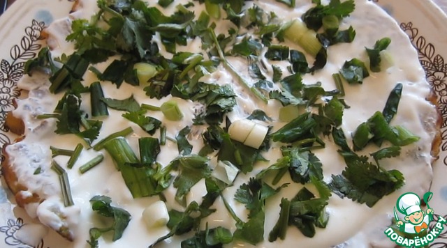 Смазываем нижний корж сметаной и посыпаем сверху зеленью, на него выкладываем верхний корж.