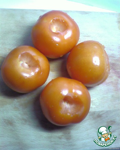 Крепкие помидорки помыть, аккуратно вырезать хвостик и нарезать кружочками толщиной 1 см