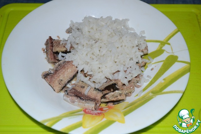Рыбу размять вилкой. Готовый рис откинуть на дуршлаг, промыть холодной водой и перемешать с рыбой.