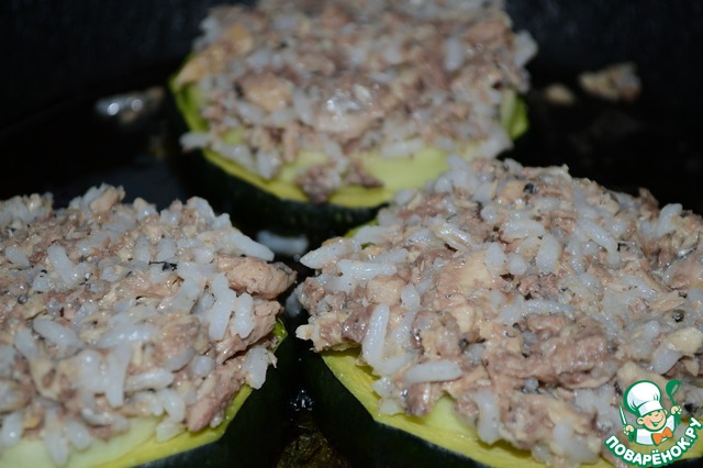 Выложить рисовый фарш на цуккини или кабачок