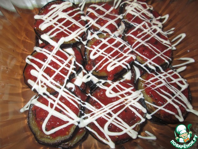 Берём высокое блюдо и выкладываем слоями. Баклажаны, помидорный соус, майонез.