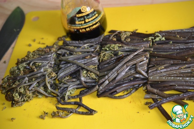 С готового папоротника сливаем воду и нарезаем его крупно, отрезками сантиметров по 5.