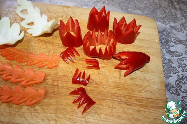 С помощью ножа для карвинга или обычного острого ножа с коротким лезвием придать моркови форму листа. Так же можно оформить листья капусты. Для этого рецепта желательно использовать перец такой формы, как на фото.