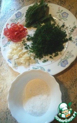 2. Мелко нарезать укроп, чеснок (я режу 2 зубчика мелко и 1 тонкими полупластинками). Перец чили надрезать вдоль и очистить от семян, нарезать тонкими колечками. В отдельную посуду высыпать соль и сахар (чтобы облегчить себе жизнь)).