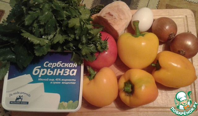 5) В миске разминаем вилкой 300 г брынзы. Добавляем к ней жареный лук, помидор, зелень, желток, свежемолотый перец. Пробуем на соль - как ни странно, даже такой, казалось бы, супер-солёный продукт, как брынза, может значительно утратить солёность после добавления всех этих ингредиентов, честное слово! Так что ориентируемся на свой вкус и, если нужно, немного подсаливаем.