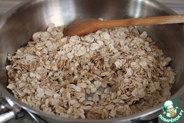 Делаю карамелизированные овсяные хлопья. В горячую сковороду вливаю оливковое масло. Всыпаю овсяные хлопья. Жарю на среднем огне, помешивая, 3-5 минут.