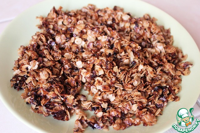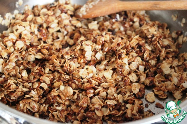 Добавляю сахар и постоянно перемешиваю. Овсяные хлопья покроются карамелью.