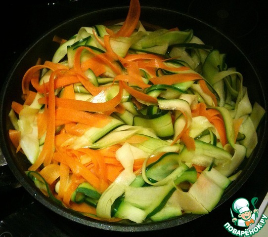 Специальным ножом срезать тонкие полоски цуккини и морковки, выложить на сковороду и тушить в масле примерно 5 минут на медленном огне.