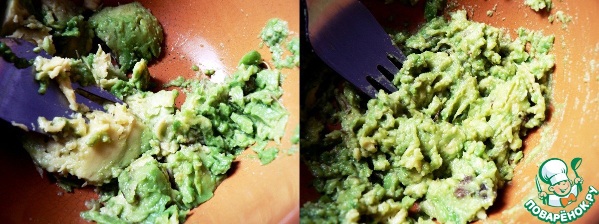 Авокадо очистить от кожуры и растолочь до крема-образной массы.