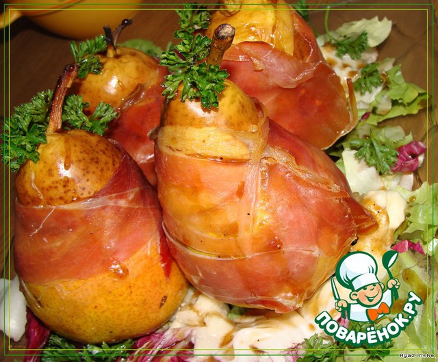 Заворачиваем каждую грушу в ломтик бекона (на мой взгляд, можно и в два ломтика),