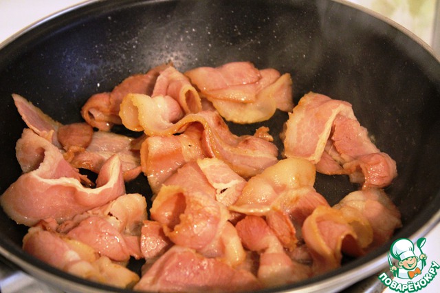 В большой хорошо разогретой сковороде обжарить ломтики бекона, предварительно, если они (ломтики) длинные, разрезать их на 2-3 части. Масло добавлять не надо, жира в беконе достаточно. Жарить до румяной корочки, не до хруста.