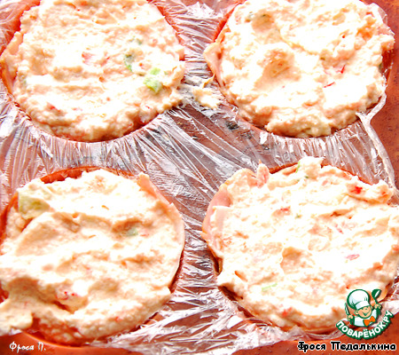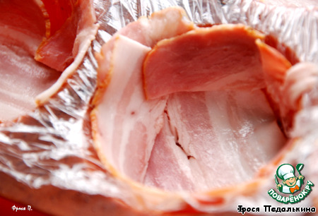 | Подглядела рецепт в ЖЖ у raechka_sav. Оригинальный рецепт делается с рыбой, собиралась и я в точности его повторить... Но после вскрытия упаковки с семгой решила не рисковать. Пришлось искать срочно замену. У меня получился не менее вкусный вариант с беконом и ветчинным муссом! |