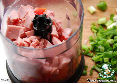 В блендере измельчить ветчину и красный перец.